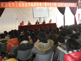 随后,学院党委副书记戴向军为本次培训班致词,他说,举办团校培训的意义在于深入贯彻落实科学发展观、党十七大和十七届六中全会精神,秉承“厚德 尚能”的校训,以提高学生干部素养为重点,对学生社团联合会、各学生社团主要干部进行集中培训。同时进一步引导广大团员和各组织学生干部以饱满的热情和良好的精神风貌积极参与到学院社团文化的建设和发展工作中去。同时,他还向培训班的学员提了三点要求,一是要端正学习态度,严肃学习纪律,以雷锋同志的“钉子”精神为楷模;二是要注重理论联系实际,将参加培训学习和促进工作紧密结合起来,践行胡锦涛总书记向青年提出的“勤于学习,善于创造,甘于奉献”的要求,全心全意为同学服务;三是养成艰苦朴素的良好品质。最后,戴书记预祝本期团校培训圆满成功。