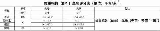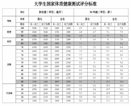 2025-2026学年体质健康测试严格参照《国家学生体质健康标准(2014年修订)》中大学生评分标准执行,各项目具体评分细则详见以下标准图片: