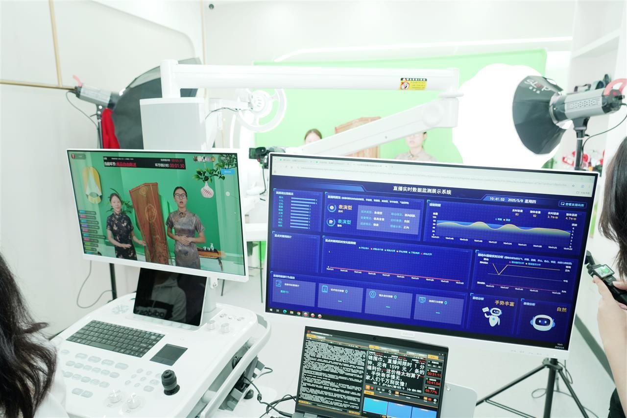 电商直播实训室里,学生们正练习直播,一台AI主播教学评价一体机实时智能分析直播内容,帮他们实时提升直播技能
