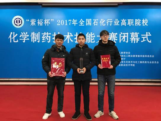 (通讯员张毅)辞旧迎新之际,从北国吉林传来捷报,在2017年全国石化行业高职院校化学制药技术技能大赛中,环境与生化工程学院金学平教授领队,吴旭乾、张毅老师指导,周济、舒聪、程佳俊等学生组成的参赛队,经过三天的鏖战,力克群雄,喜摘团体一等奖。