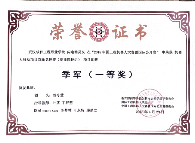 (通讯员 华滨 叶茎)2018中国工程机器人大赛暨国际公开赛4月底在中国地质大学(武汉)举行。我校共派出5支队伍参赛,其中,机械工程学院胡达、鲁家普、朱佳伟组成的参赛队喜获六足机器人竞走赛项第一名,电子工程学院鄢鼎立、叶永辉、陈梦林组成的代表队取得机器人移动项目双轮竞速赛项一等奖。机械学院其他3支队伍分获二、三等奖。