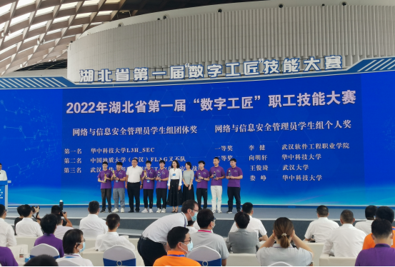 在随后举行的湖北省第一届数字工匠技能大赛网络与信息安全管理员赛项中,计算机学院任琦、王彩梅老师指导的刘景源、李健、王舒畅同学与来自华科、武大等多所高校以及全省企事业单位共45只队伍同台竞技,获得学生组个人赛第一名、第八名和第十名,学生组团队赛第三名。