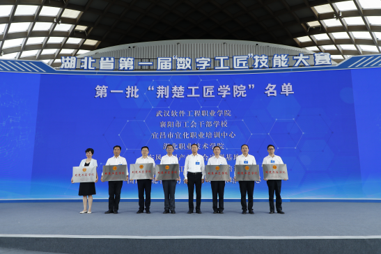 (通讯员 周思思)9月22日,在2022年湖北省第一届“数字工匠”职工技能大赛开幕式上,省人大常委会副主任、省总工会主席刘雪荣为7家单位授“荆楚工匠学院”匾牌。我校成为首批入选的“荆楚工匠学院”,副校长杨京湘现场接受授牌。