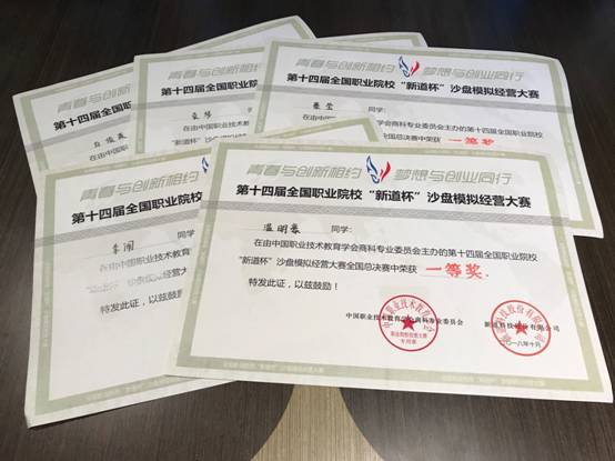 10月21日,在山东举行了第十四届全国职业院校“新道杯”沙盘模拟经营大赛全国总决赛,来自全国98所高职院校的代表队参赛。徐婧、刘珍老师指导,李闹、温明豪、白俊英、蔡莹、袁琴五位同学组成的代表队在比赛中发挥出色,在开局落后的巨大压力下奋起直追,最后反超对手勇夺一等奖。